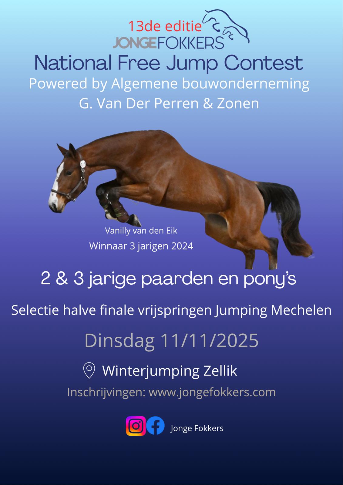 Op dinsdag 11 november staat bij Winterjumping Zellik de 13e editie van de National Free Jump Contest van de Jonge Fokkers op het programma. De wedstrijd vrijspringen gaat van start met een reeks voor 2- en 3-jarige pony’s. Aansluitend volgen de 2-jarige merries en dan de 2-jarige mannelijk. De laatste reeks van de dag is die voor 3-jarigen. Bij de 2-jarigen is er opnieuw een selectie voor de halve finale van het vrijspringen voor Jumping Mechelen.