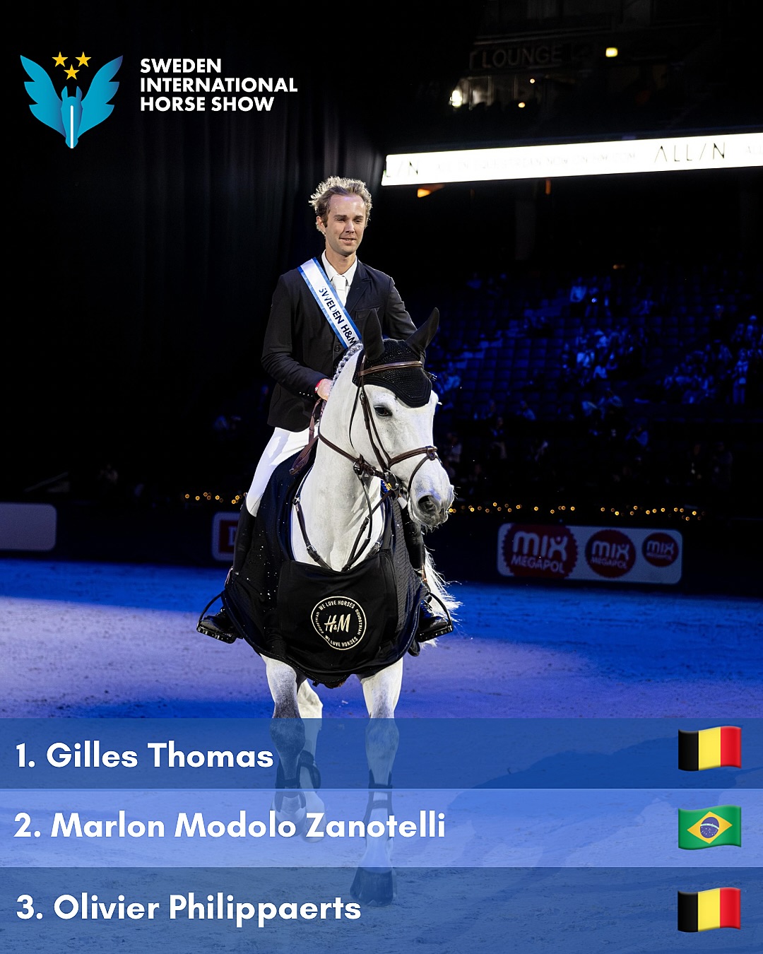 Na winst in de CSI4* Grote Prijs van Maastricht enkele weken geleden heeft Stal Nieuwenhof ruiter Gilles Thomas nu ook de vier sterren Grote Prijs van Stockholm gewonnen. In deze 1m55 hoge Grote Prijs wisten zeven combinaties zich te plaatsen voor de barrage. Daarin ging de overwinning naar Gilles Thomas en Chuck Marienshof Z (v. Colestus). Marlon Modolo Zanotelli en Charly Heart (v. Cornet Obolensky) volgden op een tweede plaats. De derde plek ging naar Olivier Philippaerts en de BWP ruin H&M Miro (v. Diamant de Semilly).