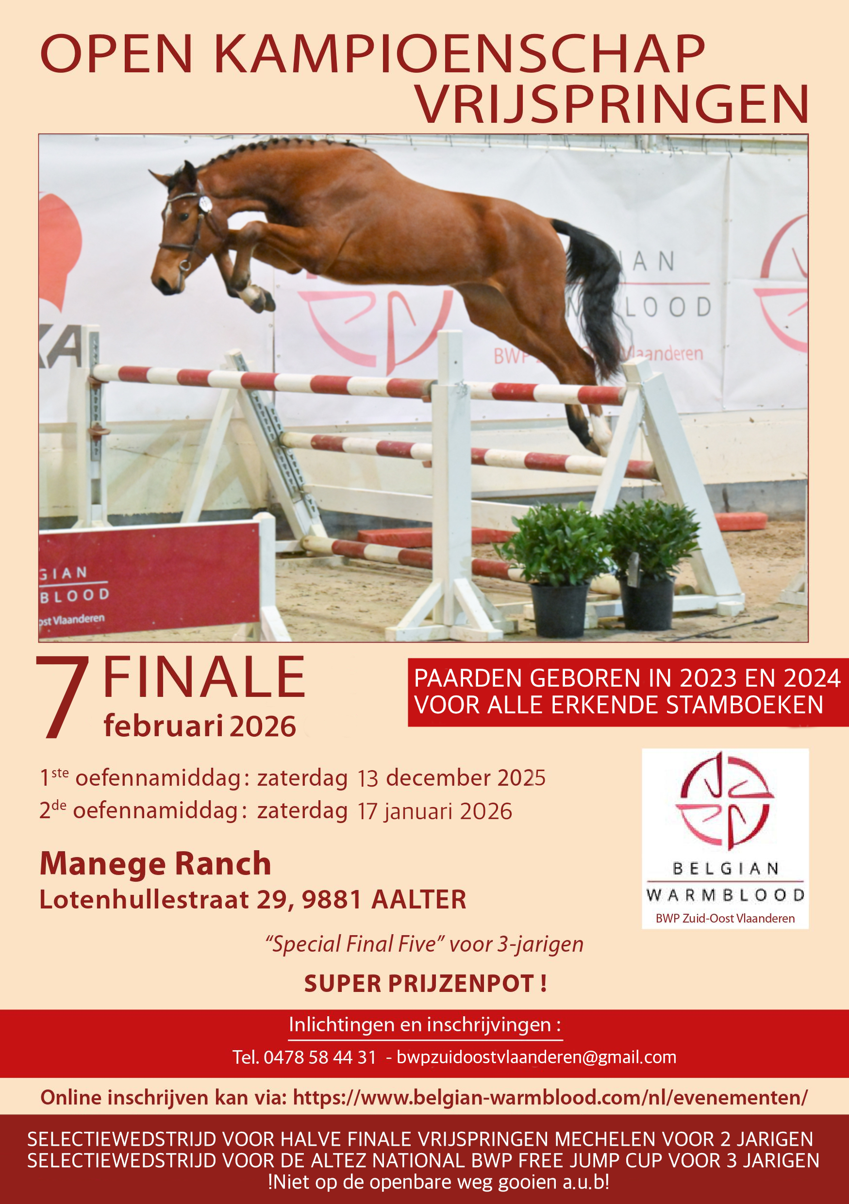 Zowel de oefennamiddagen als de finalewedstrijd gaan zoals gewoonlijk door in Manege Ranch (Lotenhullestraat 29 – 9881 Aalter) en zijn voorbehouden voor paarden geboren in 2024 en 2023 geregistreerd bij eender welk erkend warmbloedpaardenstamboek.