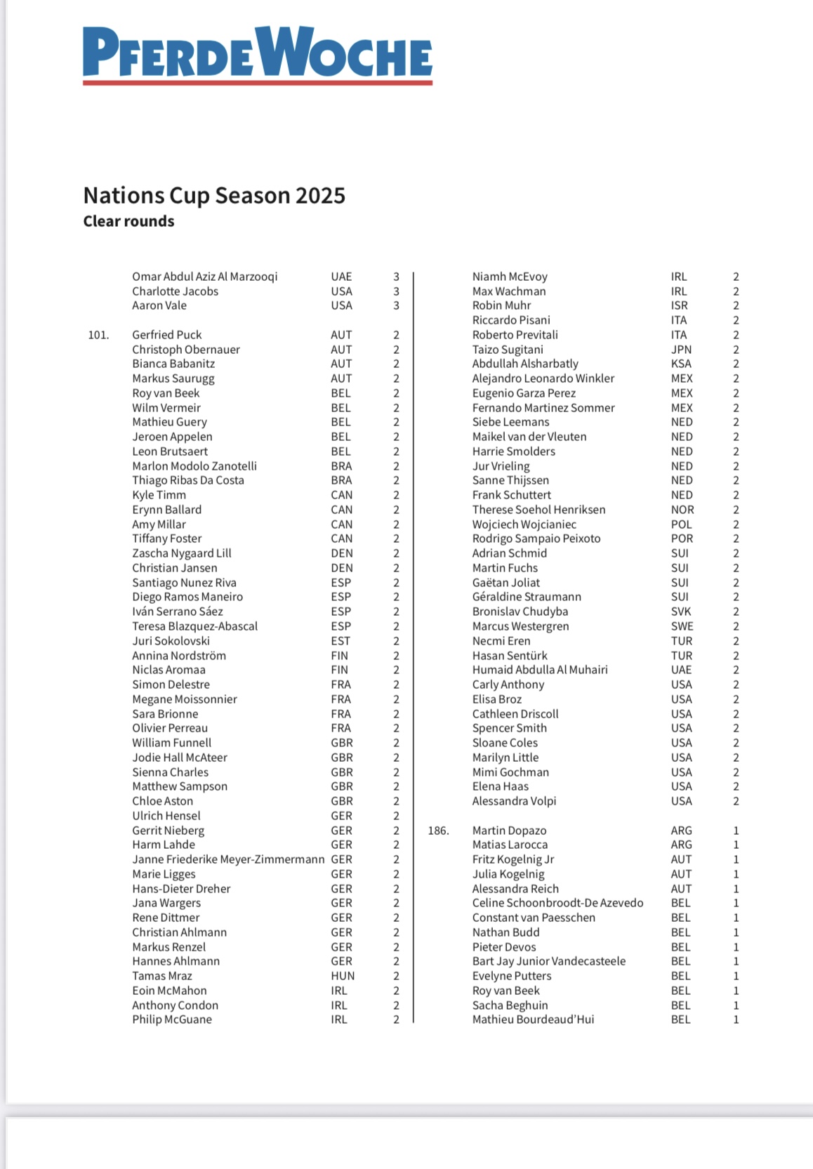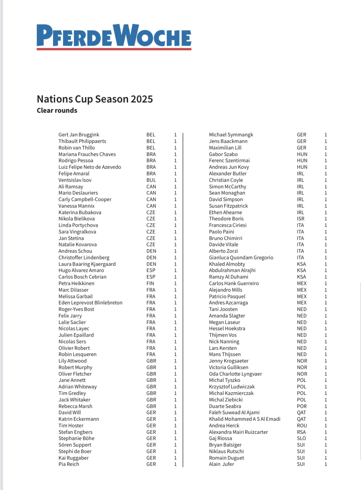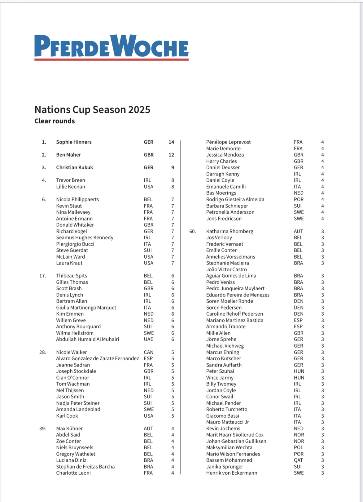 Het Nations Cup-seizoen 2025 kwam ten einde in Vejer de la Frontera (POR), met in totaal 766 foutloze omlopen verspreid over 34 wedstrijden wereldwijd. In de exclusieve ranglijst van het Zwitserse paardensportmagazine «PferdeWoche» kwam de Duitse Sophie Hinners naar voren als dé uitblinker van het seizoen. Zij verdiende de titel «Ms. Nations Cup» 2025 met maar liefst 14 foutloze omlopen. Net als vorig jaar ging de tweede plaats naar de Brit Ben Maher met twaalf foutloze omlopen, terwijl Olympisch kampioen van Parijs Christian Kukuk (GER) derde werd met negen. Duitsland voerde ook overtuigend het landenklassement aan met 83 foutloze omlopen, gevolgd door Ierland met 74 en België met 69.