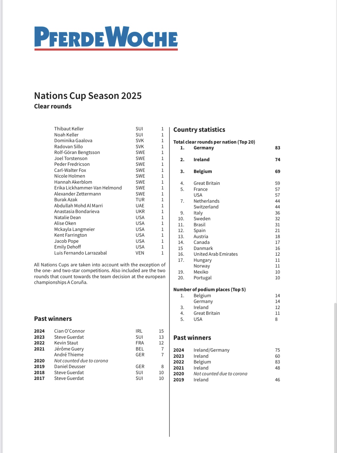 In totaal werden er dit jaar 766 foutloze omlopen gereden in de Nations Cups (tegenover 768 in 2024), verdeeld over 34 wedstrijden, inclusief de twee omlopen die meetelden voor de teamcompetitie op het EK in A Coruña. Eén amazone stak er echter met kop en schouders bovenuit: Sophie Hinners uit Duitsland, die met haar 14 foutloze omlopen de titel «Ms. Nations Cup» opeist. Zij volgt daarmee Cian O’Connor (IRL) op, die in 2024 de ranglijst aanvoerde met 15 foutloze omlopen.