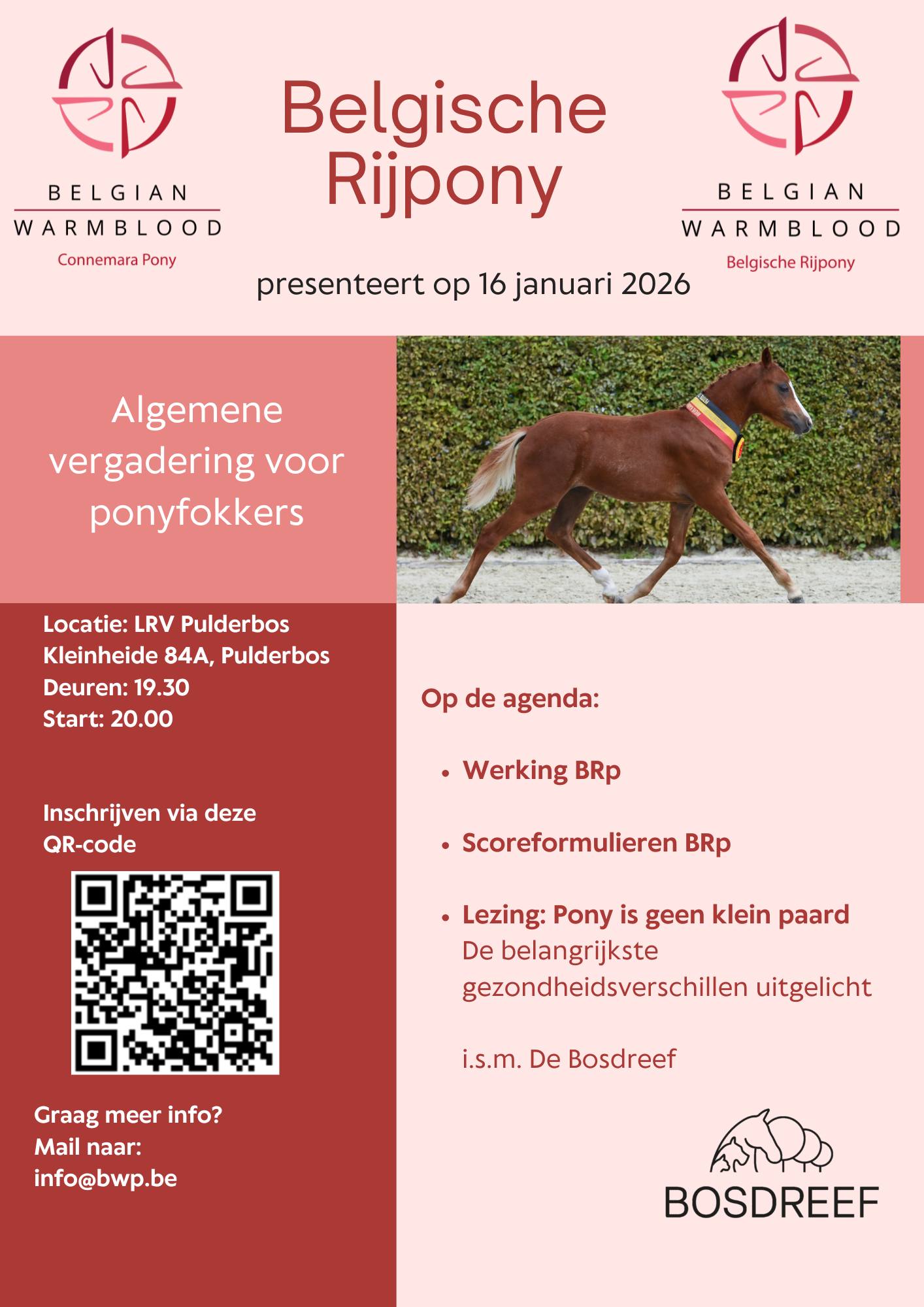 De BRp-stamboekcommissie nodigt alle ponyfokkers en iedereen met interesse in de ponyfokkerij van harte uit op vrijdag 16 januari voor een algemene vergadering die volledig in het teken staat van de BRp-werking en de verdere ontwikkeling van de ponyfokkerij. Tijdens deze informatieve avond gaan we dieper in op de werking van BRp en lichten we de scoreformulieren uitgebreid toe. Daarnaast presenteren we, in samenwerking met Dierenkliniek De Bosdreef, een boeiende lezing onder de titel “Pony is geen klein paard – de belangrijkste gezondheidsverschillen uitgelicht”, waarin de specifieke noden en aandachtspunten binnen de ponygezondheid centraal staan.