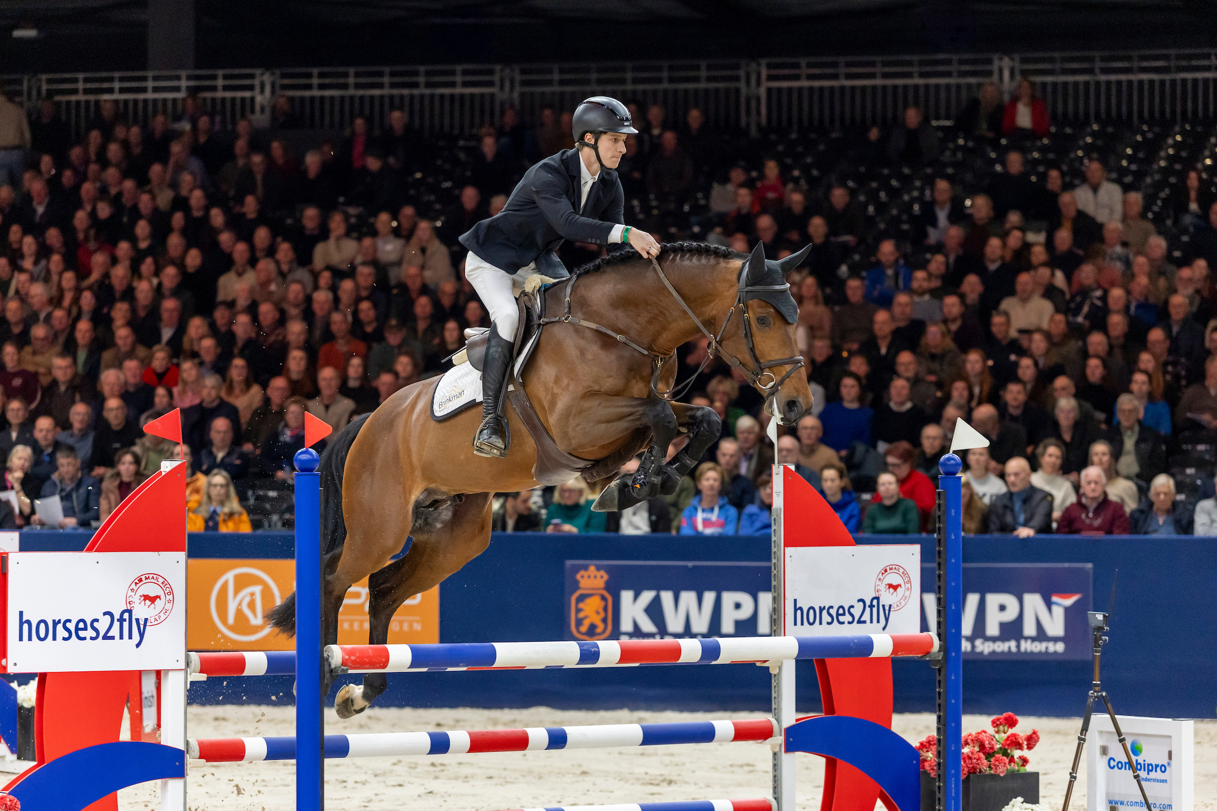 Conan Wright ging gelijk in de aanval met de super meewerkende Rising Blue (Chacco-Blue uit Zarina III ster pref prest van Heartbreaker, fokker Willy Wijnen), die hij voor Stal Brinkman en Jeroen Verver rijdt. Het resulteerde in een foutloze rit waar alle concurrentie zich op stukbeet. “Ik heb nog niet eerder een barrage gereden met Rising Blue maar had er gelijk vertrouwen in. Hij is ongelooflijk voorzichtig, heeft veel bloed en een geweldige instelling. Ik hoef nooit bang te zijn dat hij een foutje maakt, ook als ik wat harder moet rijden zoals vandaag”, vertelt de winnaar. De beste poging om Rising Blue van de eerste plek te houden werd geleverd door die andere ‘Rising’ hengst, krachtpatser Rising Aranix (Aganix du Seigneur uit Lady D van ’t Roosakker sport-spr van Echo van ’t Spieveld), die zijn naam overigens te danken heeft aan fokker Rising Stud uit Froombosch. Keer op keer overtuigt deze hengst met zijn inzet, gemak en vermogen. Daarbij laat hij zich zeer goed rijden en dat demonstreerde hij in de finale onder Kristian Houwen opnieuw. Op de derde plek volgde een ander groot toekomsttalent: de zeer atletische R.Elfhaban van Beek (Elfra van Beek Z uit Habanda van Beek PROK van Hos d’O), die Conan Wright rijdt voor fokker Guido Herrijgers van ’t Eirbissenhof.