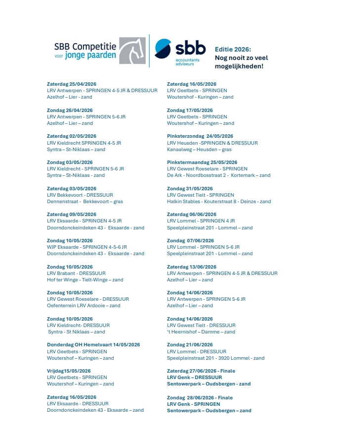 “De SBB-Competitie is volgens mij een heel toegankelijke formule om jonge paarden uit te brengen op wedstrijd en te meten met leeftijdsgenoten. Dankzij het vrijwilligerswerk binnen LRV worden deze wedstrijden aan een erg betaalbare kostprijs georganiseerd. Dat zorgt er volgens mij voor dat de focus veel meer ligt op het opleiden van je paarden dan op het terugwinnen van prijzengeld. De voorbije jaren wordt ook steeds meer ingezet op de kwaliteit van de pistes. Dat het Azelhof in Lier nu ook deel uitmaakt van de SBB-Competitie dit jaar, is daar een bewijs van. De (witte) zandbodems die goed onderhouden worden, maakt de weersafhankelijkheid kleiner waardoor ook de kwaliteit van de wedstrijd toeneemt. Sportief lijkt mij dit een erg goede keuze die de populariteit van de SBB-wedstijden enkel ten goede zal komen.”
