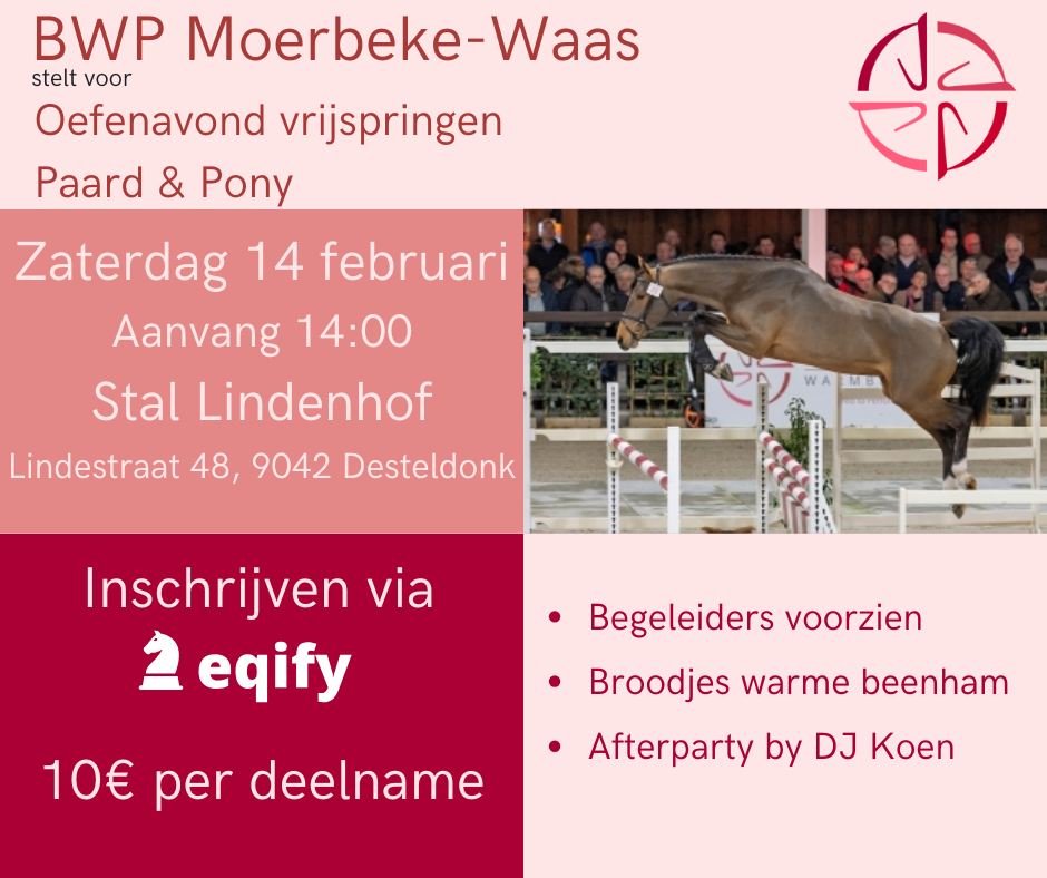 Op zaterdag 14 februari vindt het oefenmoment plaats bij Stal Lindehof in Desteldonk, met aanvang om 14.00 uur. Deelnemers kunnen vooraf inschrijven via de Eqify App of ter plaatse. De deelnameprijs bedraagt €10.
