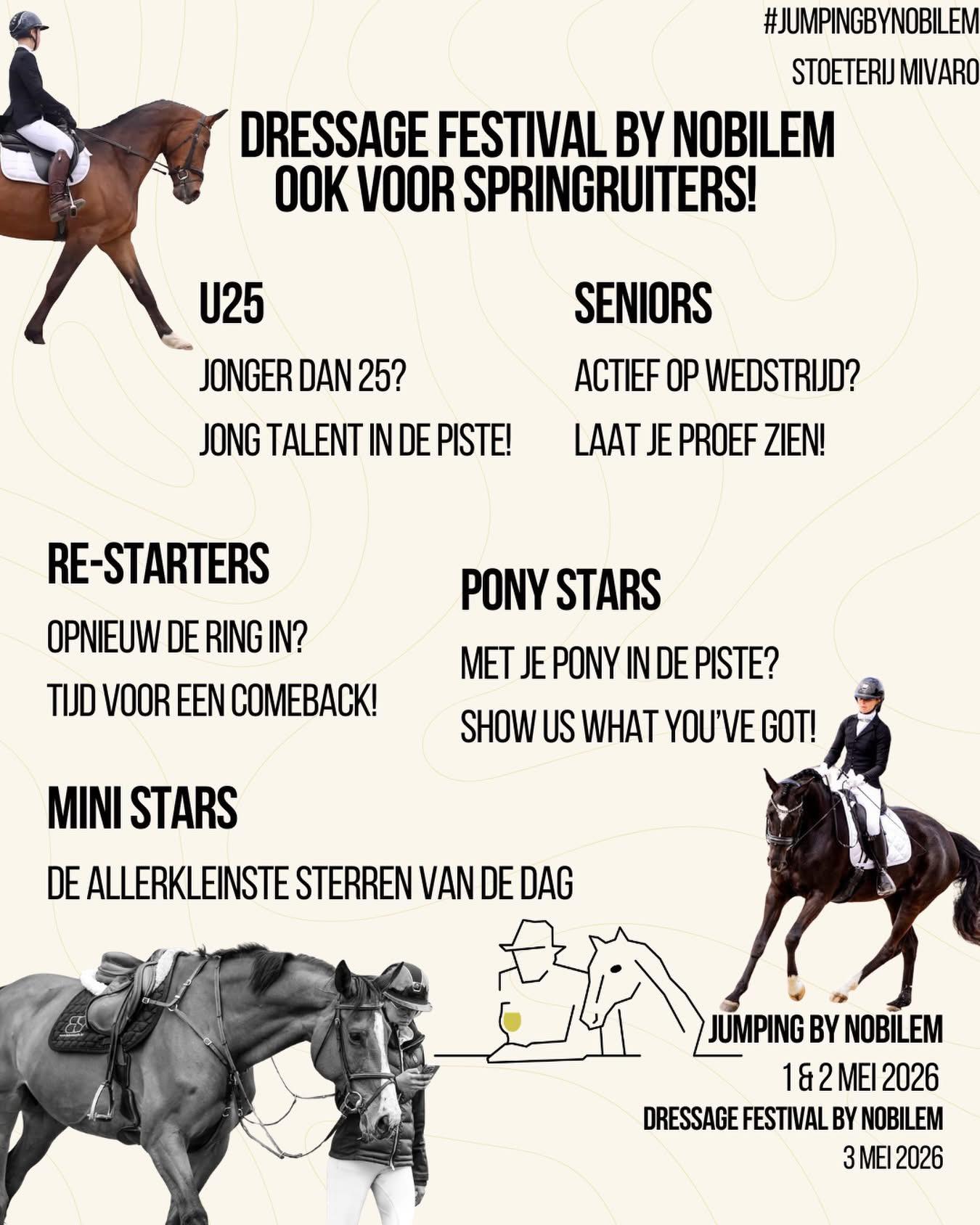 Bij Stoeterij Mivaro in Dilbeek organiseert het team van Jumping by Nobilem op 3 mei een dressuurdag waar plezier, laagdrempeligheid en motivatie centraal staan. Onder het motto "From Jumping to Dressage" willen we ruiters van elk niveau opnieuw laten proeven van de charme van de dressuursport. Het doel is eenvoudig: een fijne dag in de piste beleven, zonder druk en zonder ingewikkelde regels.